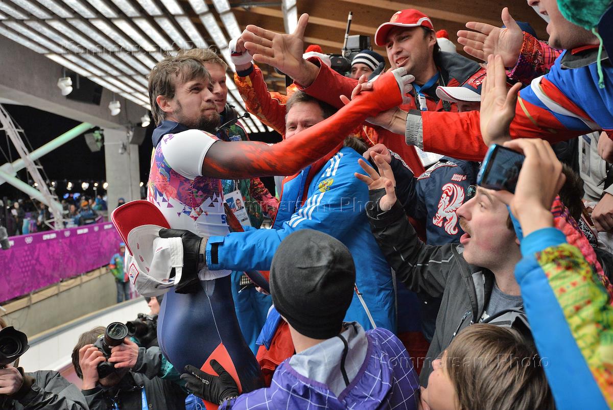 XXII Зимние Олимпийские игры в Сочи. Член олимпийской сборной России по скелетону среди мужчин, завоевавший золотую медаль Александр Третьяков во время соревнований.