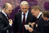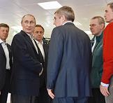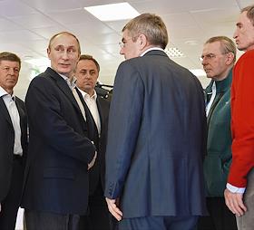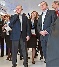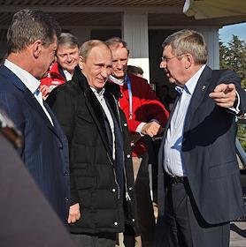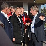 XXII Olympic Winter Games in Sochi. Russian President Vladimir Putin (center), Russian sports minister Vitaly Mutko (second right) and International Olympic Committee President Thomas Bach (right) during a visit to an exhibition of Russian regions in the main pavilion "Formula 1" in the Olympic Park in Sochi.