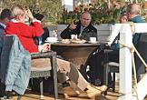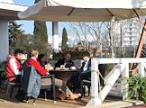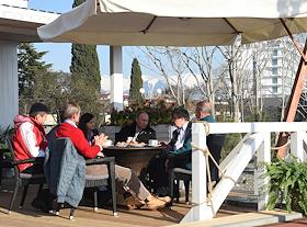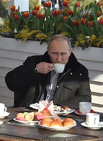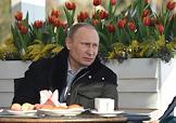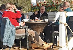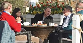 XXII Olympic Winter Games in Sochi. Governor Alexander Tkachev (left), International Olympic Committee member Jean-Claude Killy (second left), Russian President Vladimir Putin (center) and International Olympic Committee President Thomas Bach (second right) at the street cafe on the waterfront of Sochi.