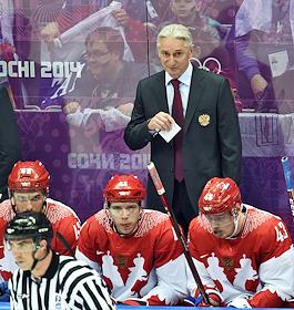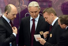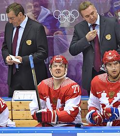 XXII Olympic Winter Games in Sochi. Members of the Russian Olympic team, from left to right: Artem Anisimov, Nikolai Kulemin, Valery Nichushkin and head coach Zinetula Bilyaletdinov (top) during the group stage match between the national teams of Russia and United States.