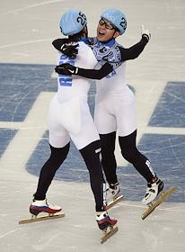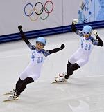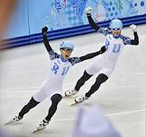 XXII Olympic Winter Games in Sochi. Members of the Russian Olympic team Vladimir Grigoriev (right) and Viktor An (left) in the final race at 1000 meters in the competition in short track men.