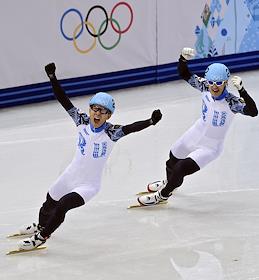 XXII Olympic Winter Games in Sochi. Members of the Russian Olympic team (foreground) Vladimir Grigoriev and Viktor An in the final race at 1000 meters in the competition in short track men.