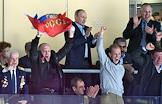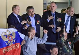 XXII Olympic Winter Games in Sochi. International Olympic Committee President Thomas Bach (left), Russian President Vladimir Putin (3rd left) during the group stage match between the national teams of Russia and United States.