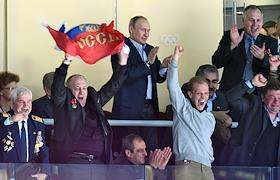 XXII Olympic Winter Games in Sochi. Russian President Vladimir Putin (left) during the group stage match between the national teams of Russia and United States.