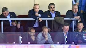 XXII Olympic Winter Games in Sochi. Russian President Vladimir Putin (center) during the group stage match between the national teams of Russia and United States.