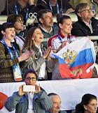 XXII Olympic Winter Games in Sochi. Member of the Russian State Duma on Physical Culture, Sport and Youth Affairs Alina Kabaeva (center) and athlete Yelena Isinbayeva (right) during the group stage match between the national teams of Russia and United States.