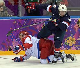 XXII Olympic Winter Games in Sochi. Member of the Russian Olympic team Andrei Markov (left) and U.S. team member David Backes (right) during the group stage match between the national teams of Russia and United States.