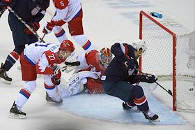 XXII Olympic Winter Games in Sochi. Members of Russian team Alexei Tereshchenko (second left), Sergei Bobrovsky (second right), Ilya Nikulin (top) and member of the U.S. National Team Cam Fowler (right) during the group stage match between the national teams of Russia and United States.