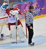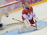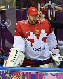 XXII Olympic Winter Games in Sochi. Member of the Russian Olympic team hockey Semyon Varlamov during the group stage match between the national teams of Russia and United States.