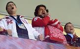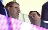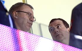 XXII Olympic Winter Games in Sochi. Representative in the Federation Council, legislative body of the Primorsky Territory Vyacheslav Fetisov (left) and Russian Prime Minister Dmitry Medvedev (right) during the group stage match between the national teams of Russia and United States.