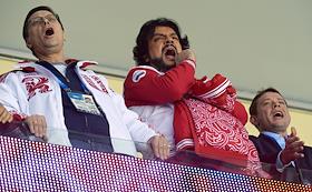 XXII Olympic Winter Games in Sochi. From left to right: first deputy chairman of the Russian State Duma Alexander Zhukov, singer Filipp Kirkorov, hockey player Pavel Bure during the group stage match between the national teams of Russia and United States.