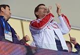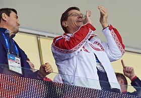 XXII Olympic Winter Games in Sochi. First Deputy Chairman of the Russian State Duma Alexander Zhukov (center) during the group stage match between the national teams of Russia and United States.