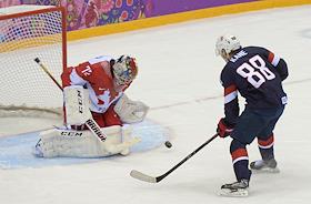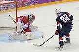 XXII Olympic Winter Games in Sochi. Member of the Russian Olympic team Sergei Bobrovsky (left) and U.S. Olympic team member Patrick Kane (right) during the group stage match between the national teams of Russia and United States.