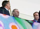 XXII Olympic Winter Games in Sochi. From left to right: President of the International Ice Hockey Federation Rene Fasel, Honorary President of the International Olympic Committee Jacques Rogge and member of the International Olympic Committee Jean-Claude Killy during the group stage match between hockey teams of Russia and United States.