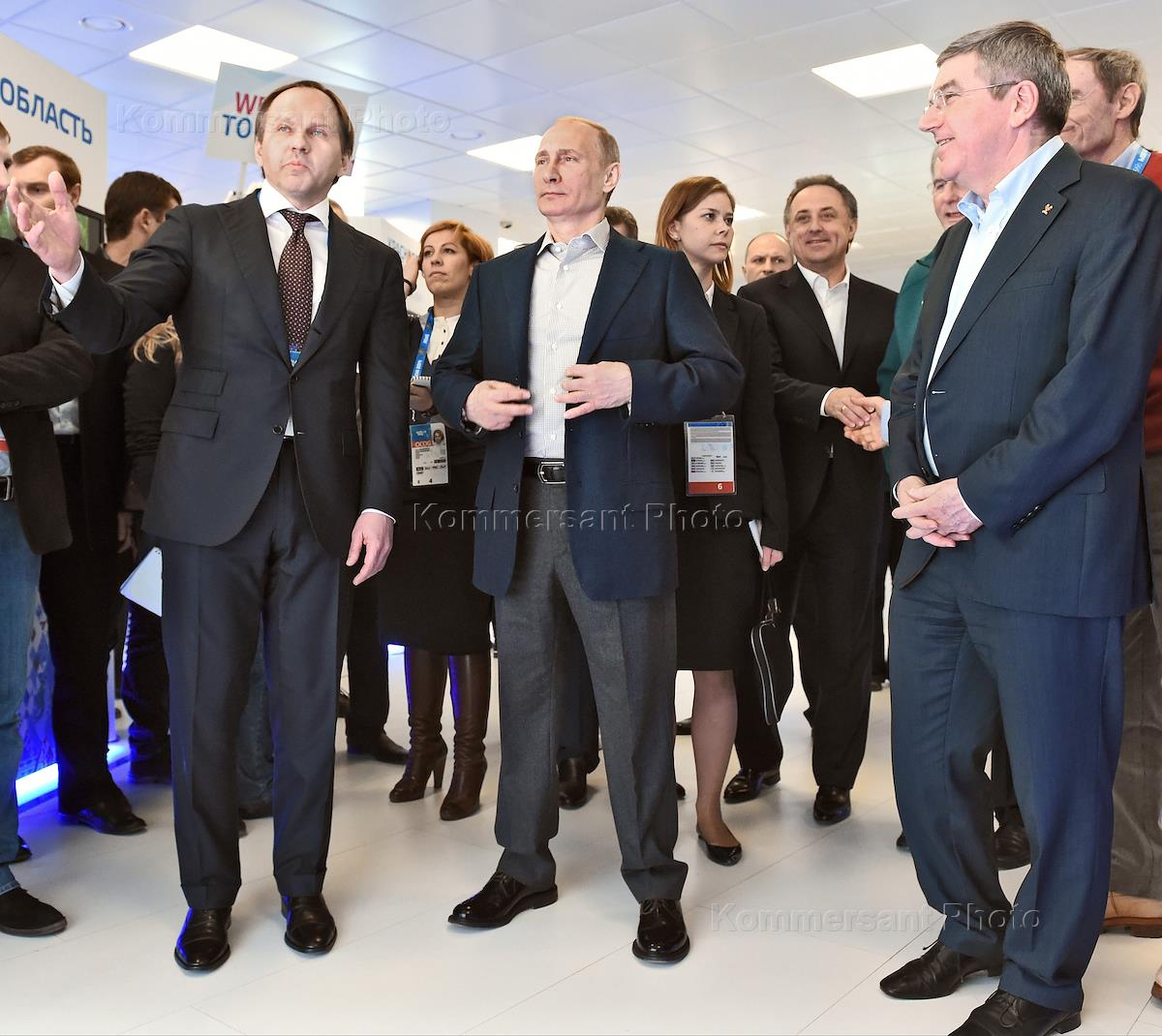 XXII Зимние Олимпийские игры в Сочи. Слева направо: заместитель председателя Правительства России Дмитрий Козак, президент России Владимир Путин, министр спорта России Виталий Мутко, президент Международного олимпийского комитета Томас Бах во время посещения Дома болельщиков олимпийской команды Швейцарии в Олимпийском парке.