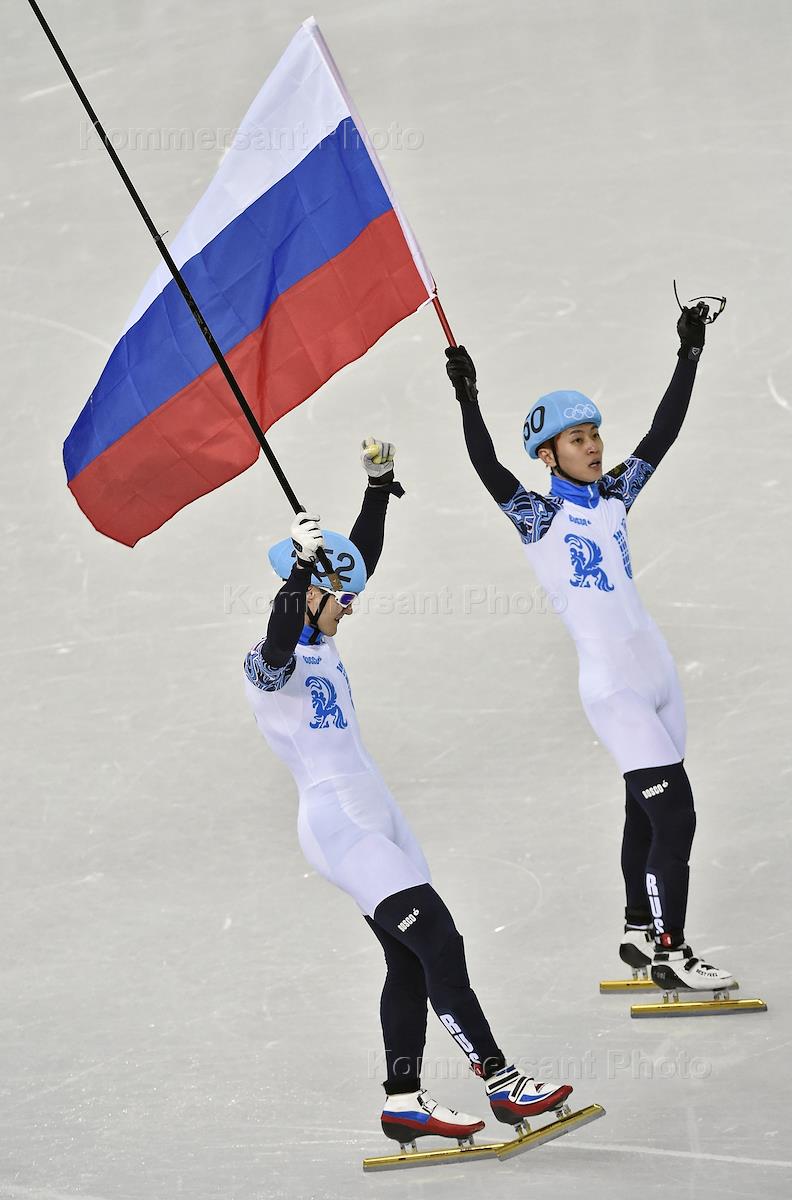 XXII Зимние Олимпийские игры в Сочи. Члены олимпийской сборной России Владимир Григорьев (слева) и Виктор Ан (справа) во время цветочной церемонии после финального забега на 1000 метров в соревнованиях по шорт-треку среди мужчин.