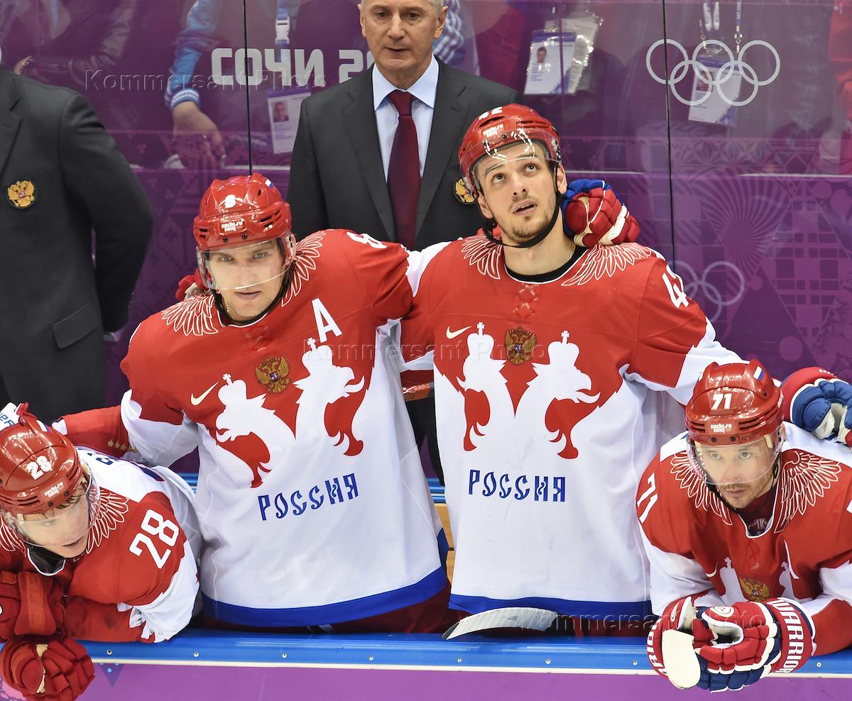 XXII Зимние Олимпийские игры в Сочи. Члены олимпийской сборной России по хоккею Евгений Малкин (слева) и Павел Дацюк (в центре) во время матча группового этапа между сборными России и США.
