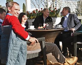 XXII Зимние Олимпийские игры в Сочи. Слева направо: заместитель председателя Правительства России Дмитрий Козак, губернатор Краснодарского края Александр Ткачев, президент России Владимир Путин. Президент Международного олимпийского комитета Томас Бах (справа) в уличном кафе на городской набережной.