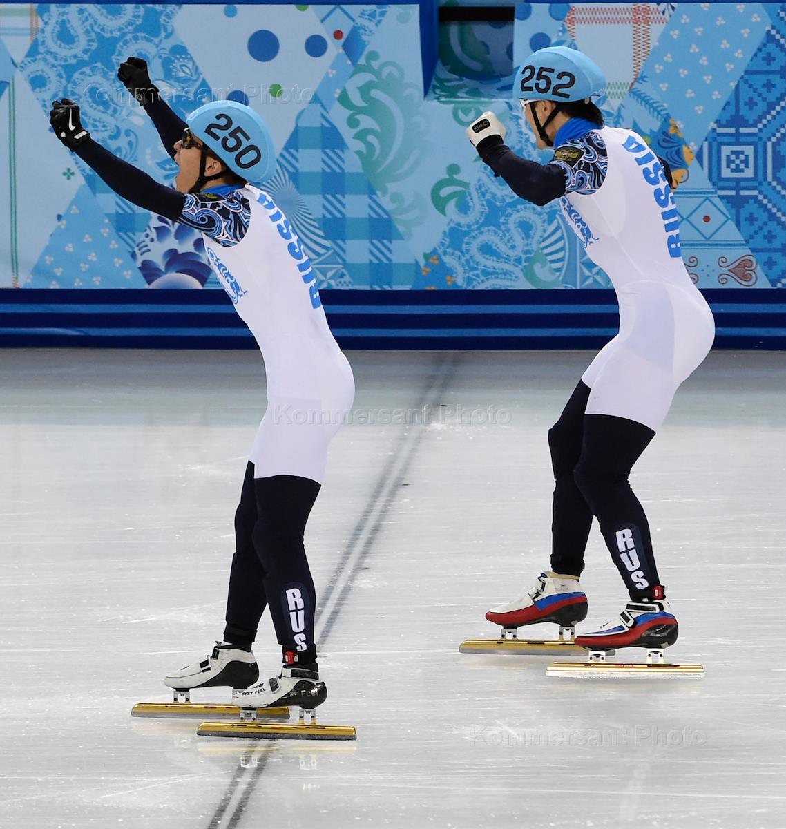 XXII Зимние Олимпийские игры в Сочи. Члены олимпийской сборной России Владимир Григорьев (слева) и Виктор Ан (справа) в соревнованиях по шорт-треку среди мужчин.