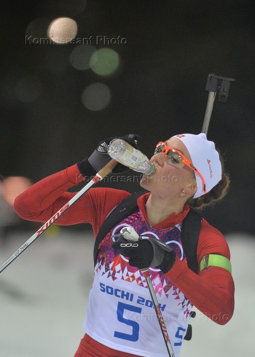 XXII Olympic Winter Games in Sochi. Mass start 12.5 km, biathlon, women. Team member of Russia in biathlon Olga Viluhina on ceremony during the competition.