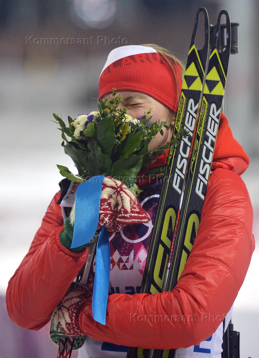 XXII Olympic Winter Games in Sochi. Mass start 12.5 km, biathlon, women. Member of the national team of Belarus in Biathlon Darya Domracheva on ceremony.