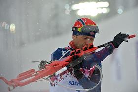 XXII Зимние Олимпийские игры в Сочи. Член олимпийской сборной Норвегии по биатлону Уле Эйнар Бьерндален во время масс-старта на 15 км среди мужчины на лыжно-биатлотном комплексе "Лаура".