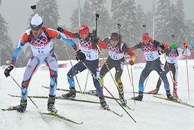 XXII Зимние Олимпийские игры в Сочи. Спортсмены слева направо: Ярослав Соукуп (Чехия), Евгений Устюгов (Россия), Арнд Пайффер (Германяи), Дмитрий Малышко (Россия), Доминик Ландертингер (Австрия) на гонке масс-старта на 15 км среди мужчины на лыжно-биатлотном комплексе "Лаура".