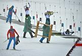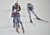 XXII Зимние Олимпийские игры в Сочи. Член олимпийской сборной России по биатлону Евгений Гараничев (слева) и член сборной Чехии Ярослав Соукуп (справа) во время масс-старта на 15 км среди мужчины на лыжно-биатлотном комплексе "Лаура".