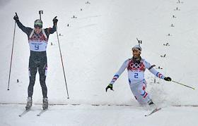 XXII Зимние Олимпийские игры в Сочи. Член сборной команды Норвегия по биатлону Эмиль Хегле Свендсен (слева) и член сборной команды Франции по биатлону Мартен Фуркад (справа) на финише гонки масс-старта на 15 км среди мужчины на лыжно-биатлотном комплексе "Лаура".