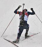 XXII Зимние Олимпийские игры в Сочи. Член олимпийской сборной Норвегии по биатлону Эмиль Хегле Свендсен на финише гонки масс-старта на 15 км среди мужчины на лыжно-биатлотном комплексе "Лаура".