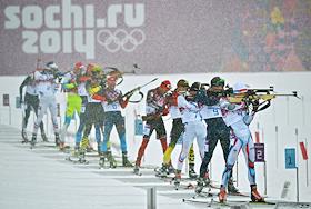 XXII Зимние Олимпийские игры в Сочи. Спортсмены во время масс-старта на 15 км среди мужчины на лыжно-биатлотном комплексе "Лаура".