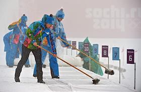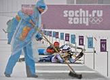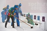 XXII Зимние Олимпийские игры в Сочи. Сотрудники комплекса для соревнований по лыжным гонкам и биатлону "Лаура" перед началом гонки с масс-старта в соревнованиях среди мужчин.