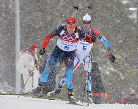 XXII Зимние Олимпийские игры в Сочи. Биатлон. Масс-старт 15 км. Мужчины. Член сборной команды Австрии по биатлону Кристоф Зуманн (слева) и член сборной команды России по биатлону Евгений Устюгов (справа) во время соревнований.