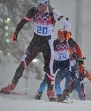 XXII Зимние Олимпийские игры в Сочи. Член сборной команды России Евгений Гараничев (второй справа) и член сборной команды Чехии Ярослав Соукуп (справа) в гонке масс-старта на 15 км среди мужчины на лыжно-биатлотном комплексе "Лаура".