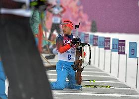 XXII Зимние Олимпийские игры в Сочи. Член сборной команды России по биатлону Евгений Гараничев в гонке масс-старта на 15 км среди мужчины на лыжно-биатлотном комплексе "Лаура".