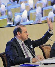 Президент Международного консультативного комитета организаций офицеров запаса и резерва, член Общественной палаты России Александр Каньшин во время слушаний на тему гуманитарного сотрудничества организаций офицеров запаса и резерва в 2014 году. Слушания прошли в Общественной палате России.