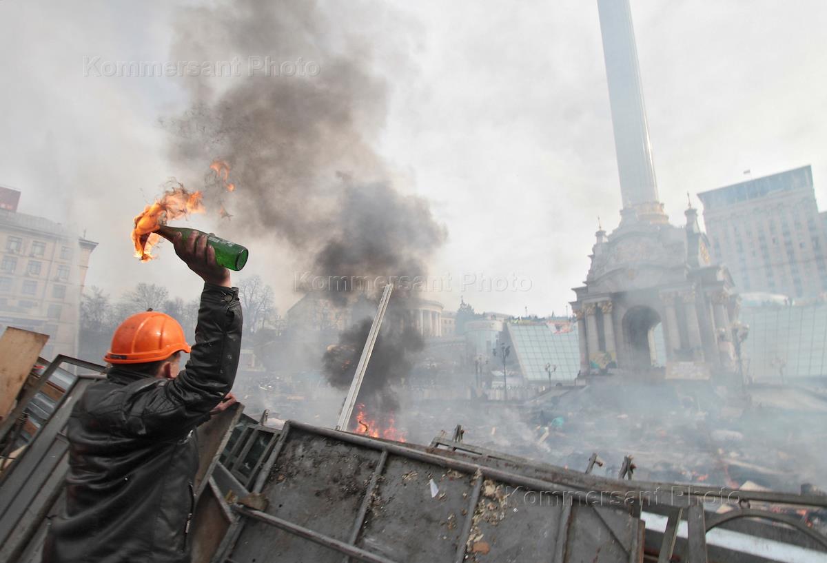 Евромайдан. Cторонник оппозиции с бутылкой с зажигательной смесью на Майдане Незалежности (площадь Независимости), где начались столкновения митингующих и сотрудников милиции.