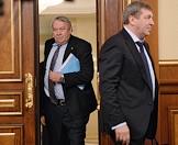Президент Российской академии наук (РАН) Владимир Фортов (слева) и министр регионального развития России Игорь Слюняев (справа) перед началом заседания правительства России.