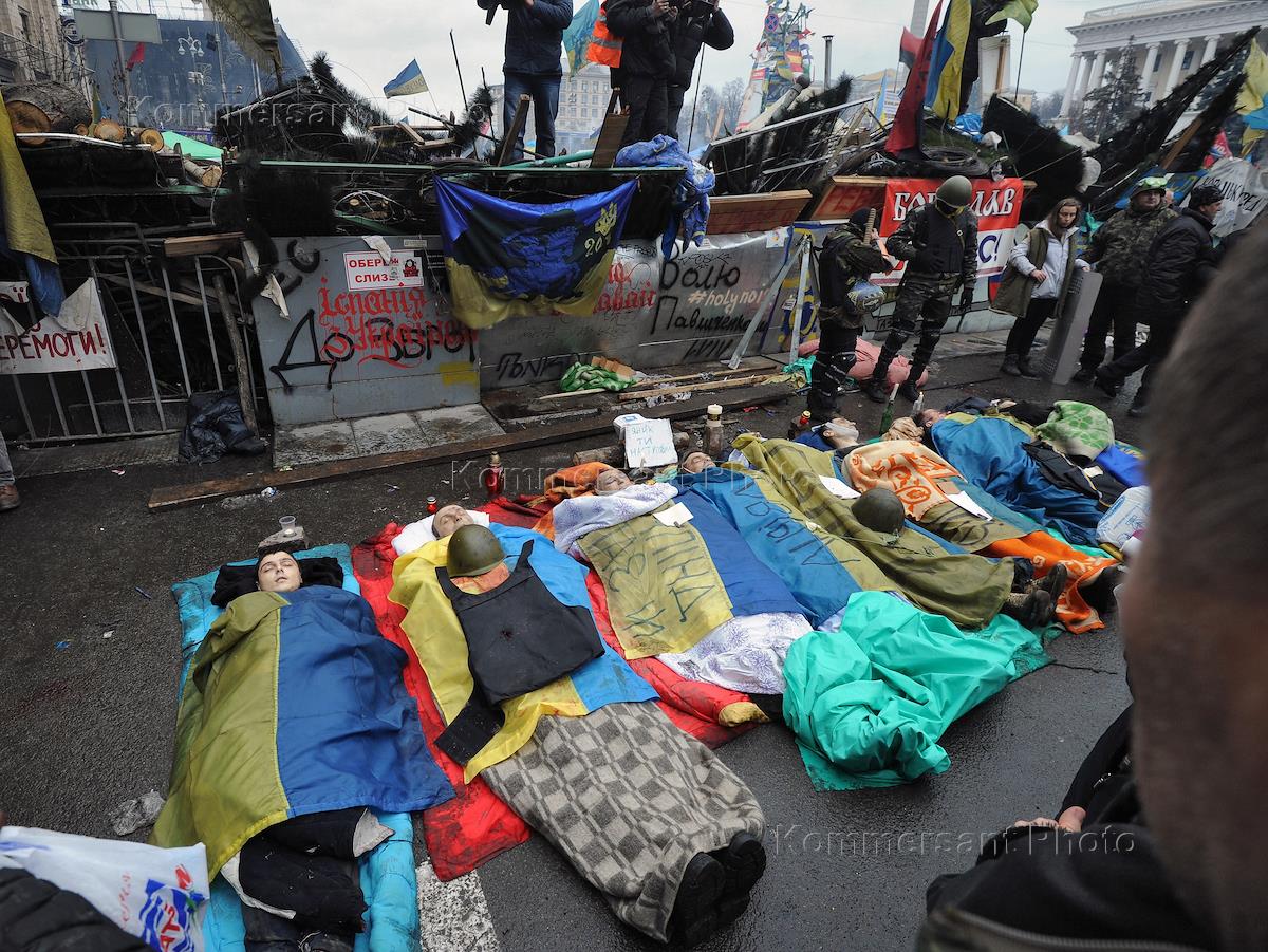 Евромайдан. Тела погибших от огня снайперов на Майдане Незалежности (площадь Независимости).