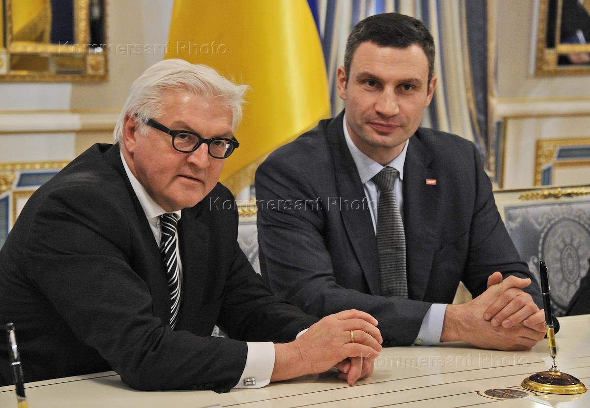 Вице-канцлер ФРГ, министр иностранных дел ФРГ Франк-Вальтер Штайнмайер (справа) и лидер оппозиции — народный депутат Верховной рады Украины VII созыва, лидер фракции Политической партии "УДАР (Украинский Демократический Альянс за Реформы) Виталия Кличко" Виталий Кличко (справа) во время подписания соглашения об урегулировании политического кризиса на Украине.