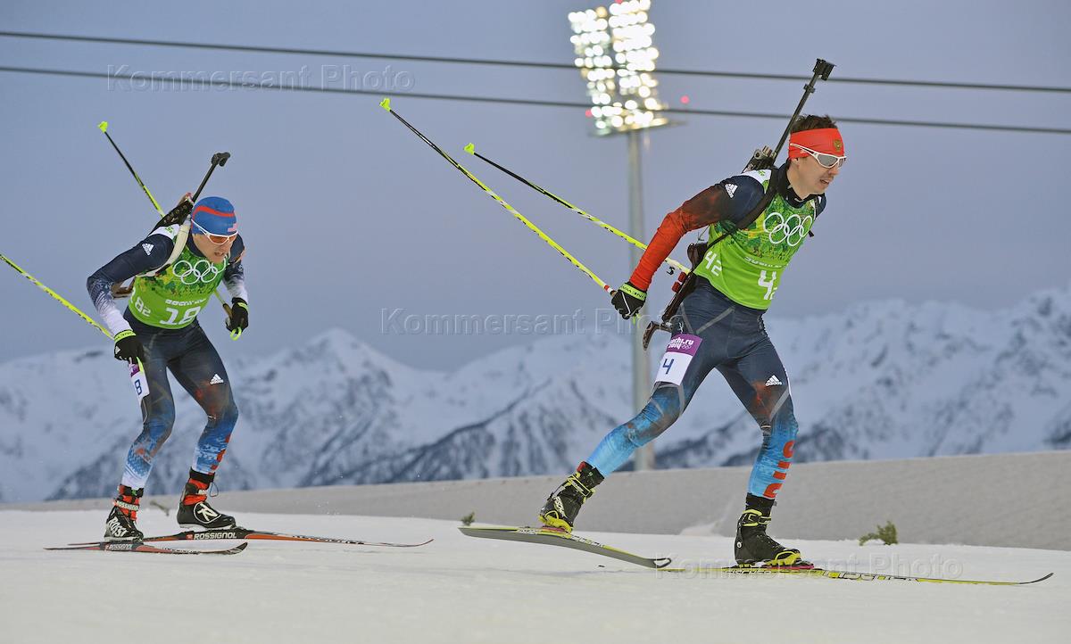 XXII Зимние Олимпийские игры в Сочи. Члены сборной команды России по биатлону Дмитрий Малышко (слева) и Антон Шипулин (справа) во время эстафетной гонки в соревнованиях по биатлону среди мужчин.