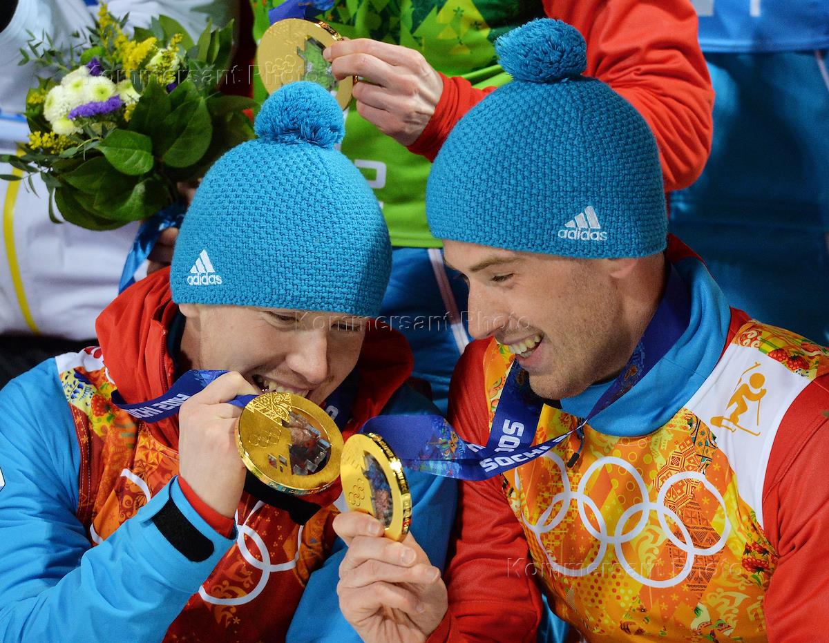 XXII Olympic Winter Games in Sochi. From left to right: members of the national team of Russia in biathlon Alexei Volkov, Evgeny Ustyugov, Dmitry Malishko and Anton Shipulin during the awards ceremony after the relay race in biathlon.
