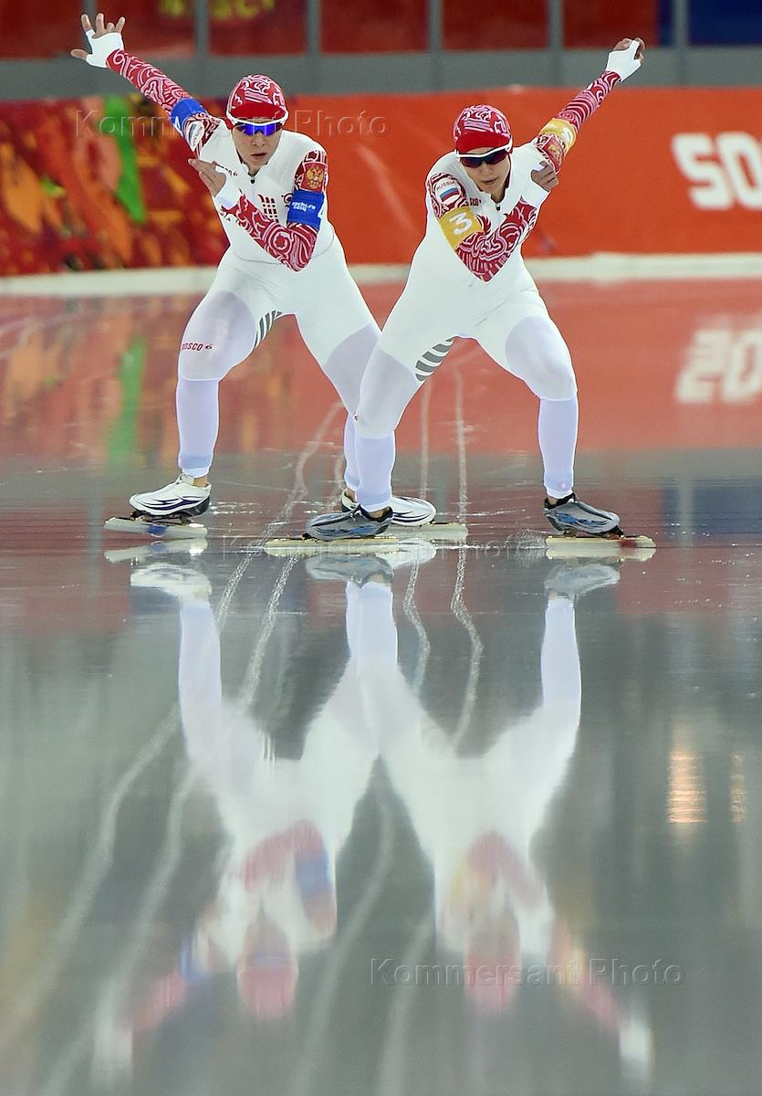 XXII Olympic Winter Games in Sochi. Members of Russian team Olga Graf, Ekaterina Shikhova and Julia Skokova at a distance in the semifinals Team Pursuit competitions in speed skating among women.