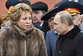 День защитника Отечества. Председатель Совета Федерации России Валентина Матвиенко (слева) и президент России Владимир Путин (справа) во время церемонии возлогажения цветов к Могиле Неизвестного Солдата.
