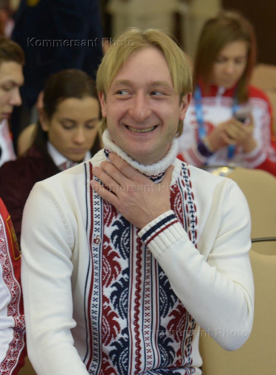 Members of the Russian Olympic team, from left to right: Dmitry Solovyov, Xenia Stolbova, Evgeni Plushenko, Fedor Klimov and Alexander Tretyakov after the awards ceremony of winners of the XXII Winter Olympic Games in Sochi.