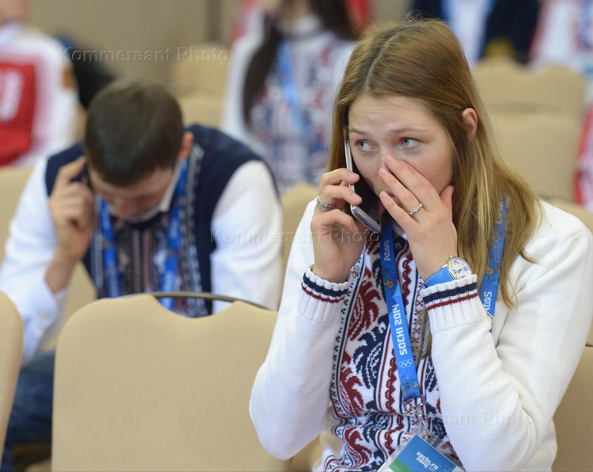 Members of the Russian Olympic team in skating Yulia Skokova (left) and Olga Graf (right) after the awards ceremony of winners of the XXII Winter Olympic Games in Sochi.