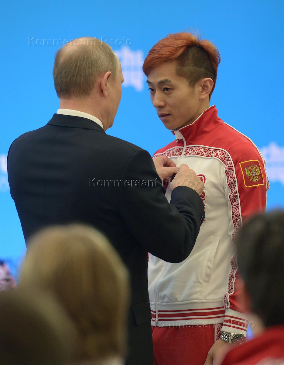 Russian President Vladimir Putin (left) and three-time Olympic champion and Olympic bronze medalist in short-track Viktor An (right) during the awards ceremony of winners of the XXII Winter Olympic Games in Sochi.