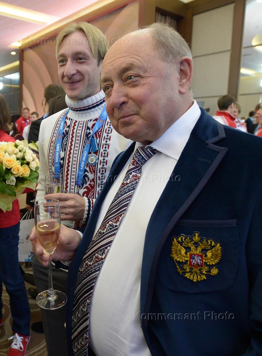 Members of the Russian Olympic team Albert Demchenko (left) and Evgeni Plushenko (right) during the awards ceremony of winners of the XXII Winter Olympic Games in Sochi.