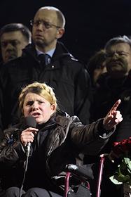 Евромайдан. Лидер БЮТ Юлия Тимошенко, освобожденная из-под стражи решением Верховной рады, на сцене Майдана. Справа налево на заднем плане: внефракционный народный депутат Петр Порошенко, дочь и заместитель лидера партии Женя Тимошенко, народный депутат фракции ВО "Батькивщина" Григорий Немыря, лидер фракции ВО "Батькивщина" Арсений Яценюк и лидер ВО "Свобода" Олег Тягныбок.