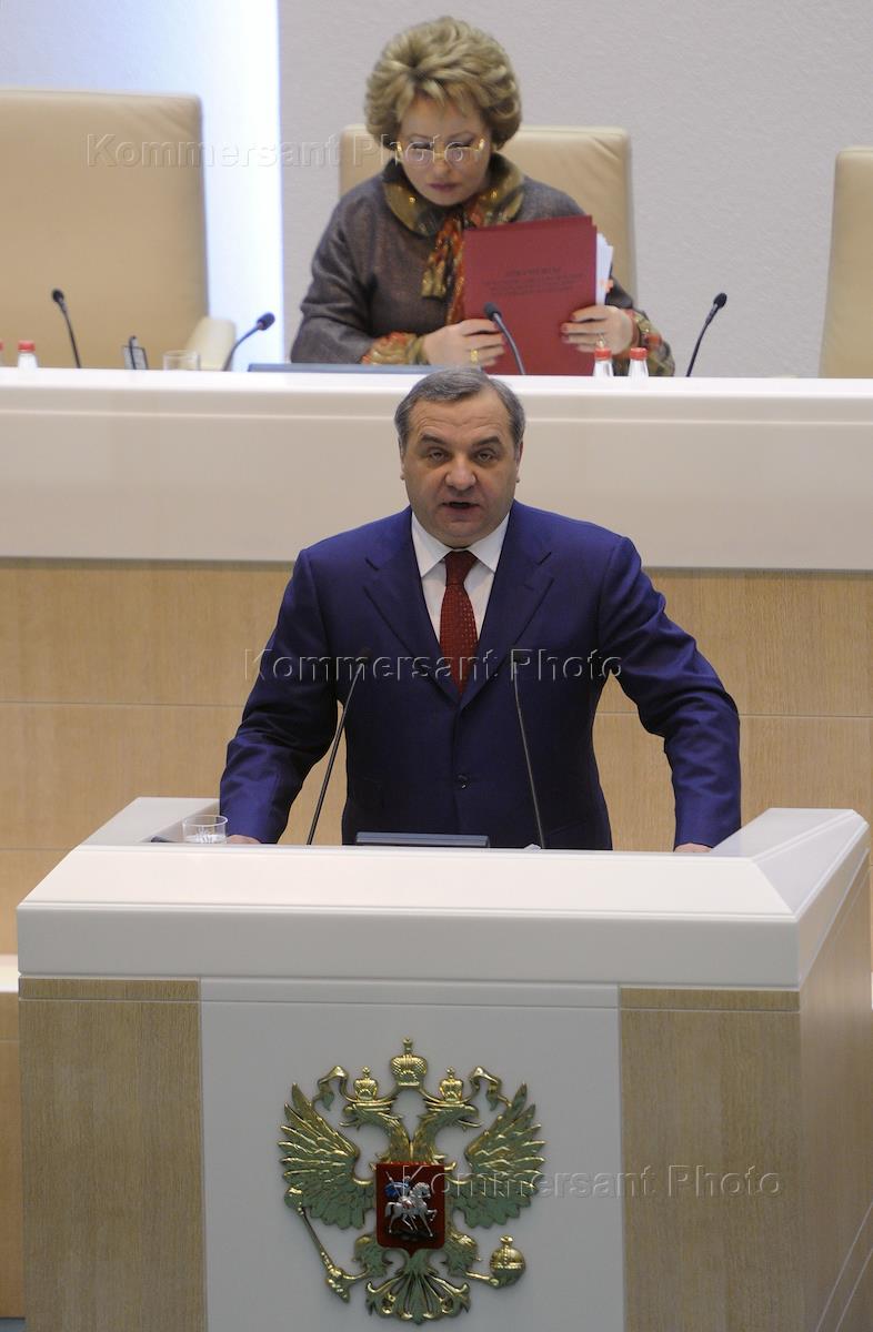 Пленарное заседание Совета Федерации России. Слева направо: министр России по делам гражданской обороны, чрезвычайным ситуациям и ликвидации последствий стихийных бедствий Владимир Пучков, заместитель председателя Совета Федерации Юрий Воробьев и представитель в Совете Федерации России от исполнительного органа государственной власти Тульской области Артур Чилингаров перед началом заседания.